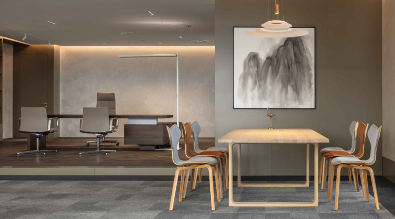 In the office space of the chairman, the functional configuration becomes the protagonist. The high-level texture is reflected by uses of wood and leather materials. The whole area reveals a calm atmosphere with a concise style.