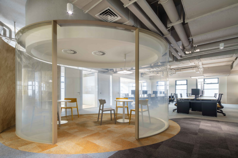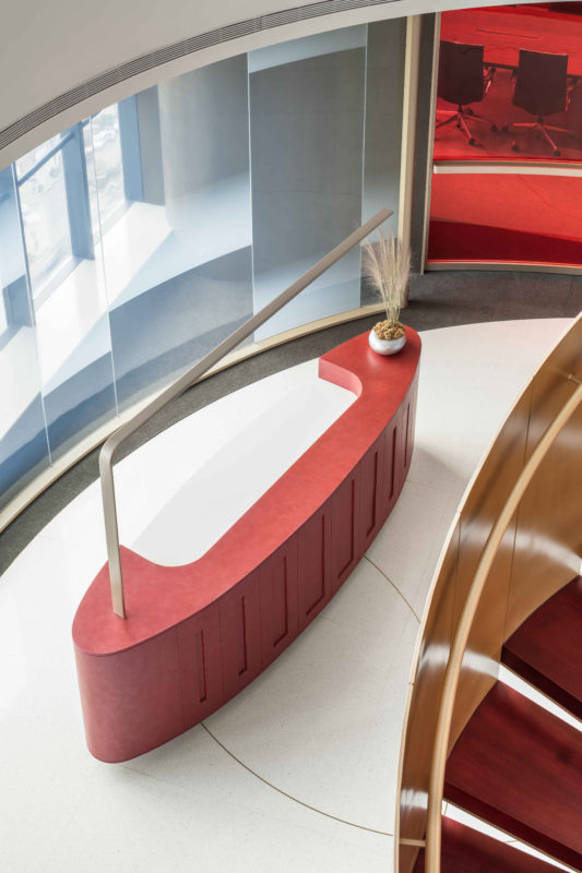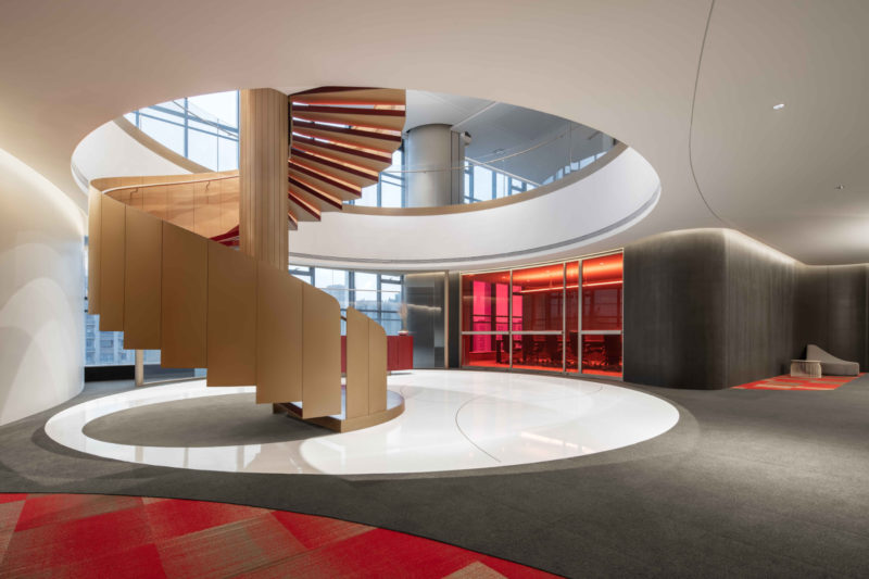 “HONGDesigworks builds spiral stairs, beautiful dimensional artwork to achieve spatial unity of the board and office floors. The shape of the circle and spiral arrangement of the stairs allows function and visual aesthetic perception to combine perfectly.