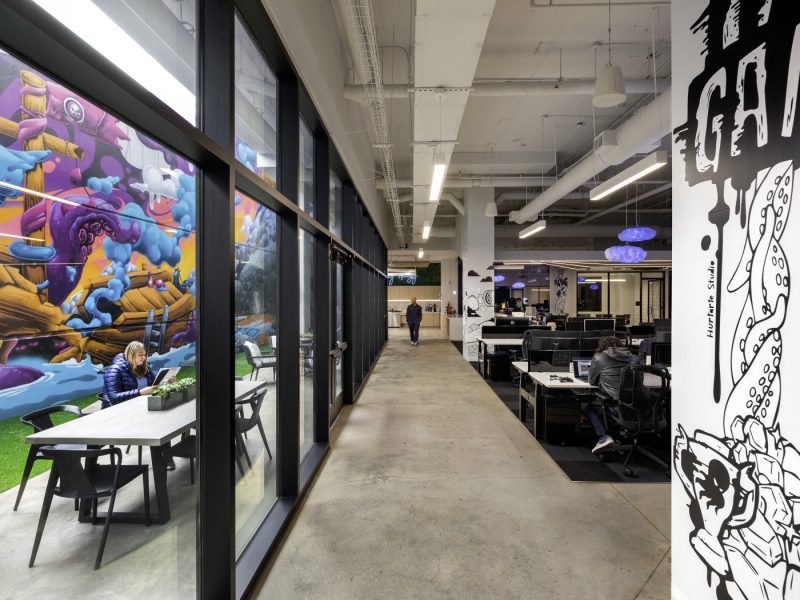 The office space is occupied by INK Games™, an innovative gaming company that relocated its headquarters to Austin, TX last year. The company put their own stamp on the space commissioning famed Texas muralist Tarbox to create an energetic focal point on the courtyard and inside walls, along with other unique art installations like a Nerf armory and living plant wall.”