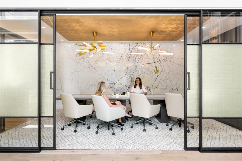 “Britt Design Group’s mission was to provide Moreland Properties with functional and flexible areas where meetings can be held privately or opened up for large events and group gatherings. Flexibility in the design and layout were essential. The state-of-the-art conference room flows directly into the entry lounge and a collaborative library space, designed for showcasing Moreland Properties’ finish materials and floorplans.