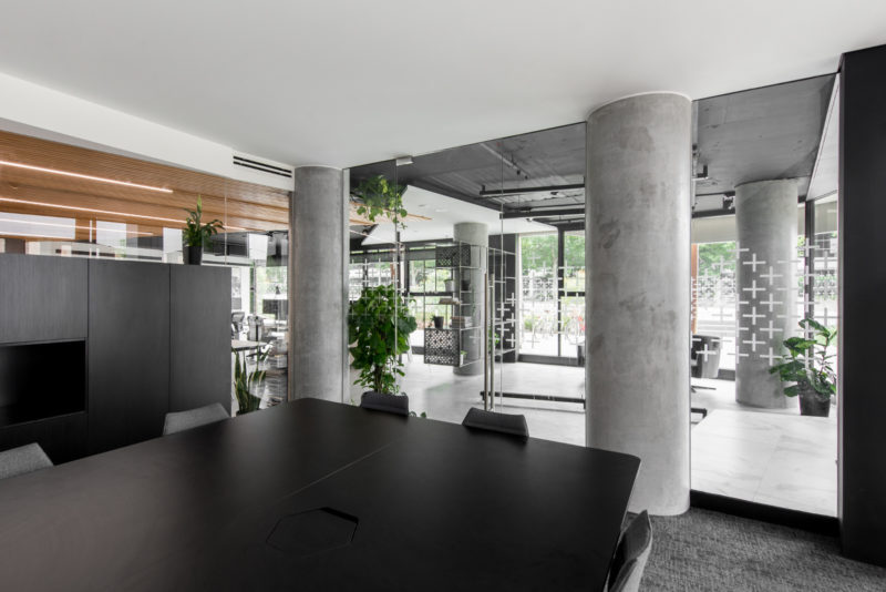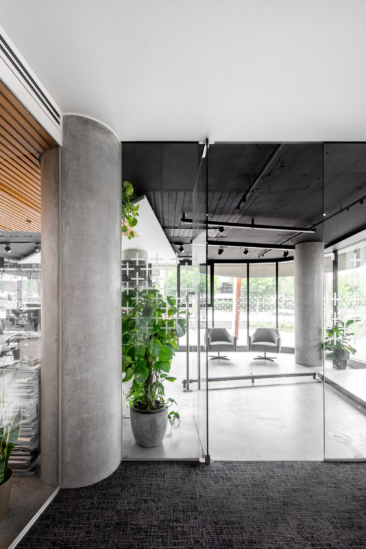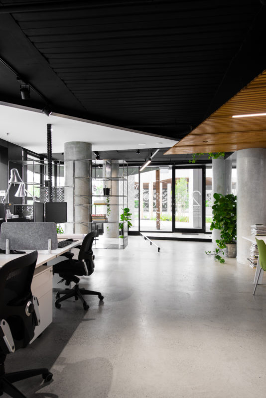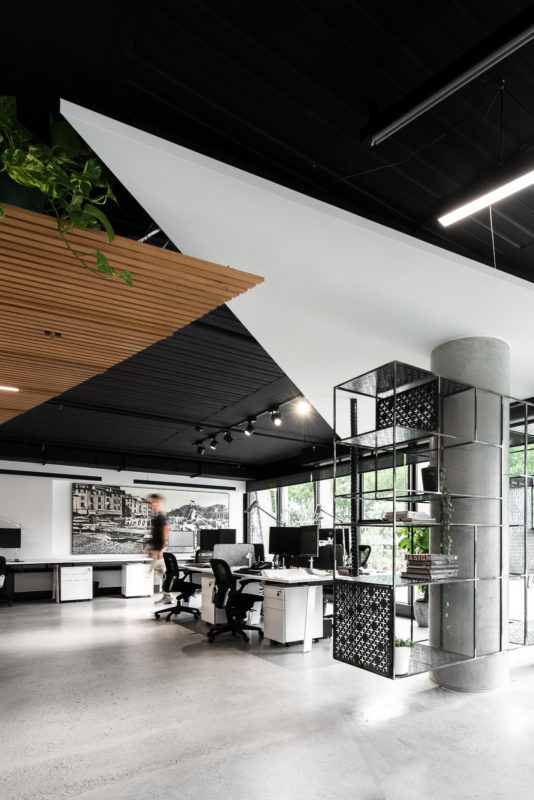 Located alongside the Yarra on a prominent Victoria Street site, the 135-square-metre office occupies a ground-floor tenancy of the Sanctuary apartment development. Bold geometry and honest materials create a masculine aesthetic. Raw concrete floors and columns contrast with timber-battened ceiling panels, while trailing greenery softens the hard edges. Frameless glass panels play with ideas of openness and enclosure, ensuring visual connections throughout the space while maintaining privacy where it’s needed.