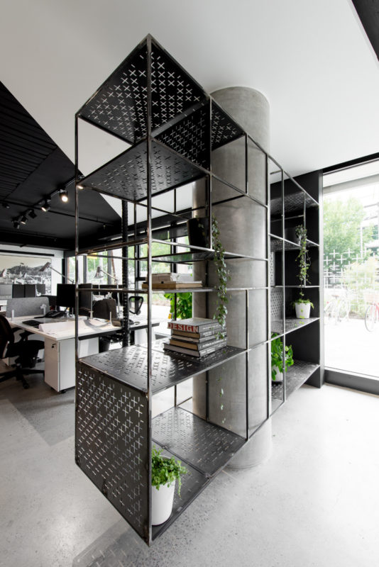 The studio’s trademark crosshair motif is embedded in the design, creating a subtly branded interior. It appears as a window decal and again in the custom shelving unit suspended from a concrete pillar. Designed by director Henry Sgourakis, this finely detailed unit celebrates its own construction, with unpolished welds and a lustrous patina. Elsewhere, streamlined furniture from Space and Arthur G finishes the interior,” says SGKS Studio.