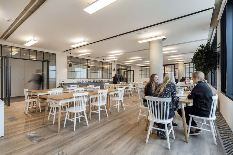 Inspired by the concept of “going home to work”, this office uses domestic design elements to create a calm atmosphere. Key areas in the office such as the library space and the dining room, emulate cosy spaces that you would usually expect to find in a home. These areas provide staff with open areas which they can use for quiet working or sharing lunch together away from their desks.
