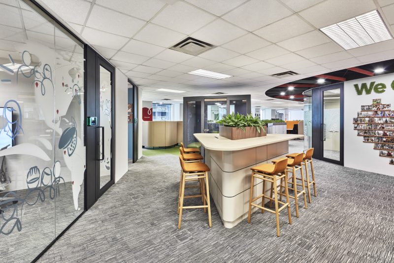 Visitors are greeted by a rich palette of chocolate hues, textures and fine detailing as they step into the reception and Chocolate Studio, a multi-sensory brand experience that tells the Barry Callebaut story, from bean to bar. From the unique curved features that resembles a cocoa bean, to artisanal touches and warm earthy tones used throughout the office, every element was carefully considered to reflect the company’s brand and quality standards.
