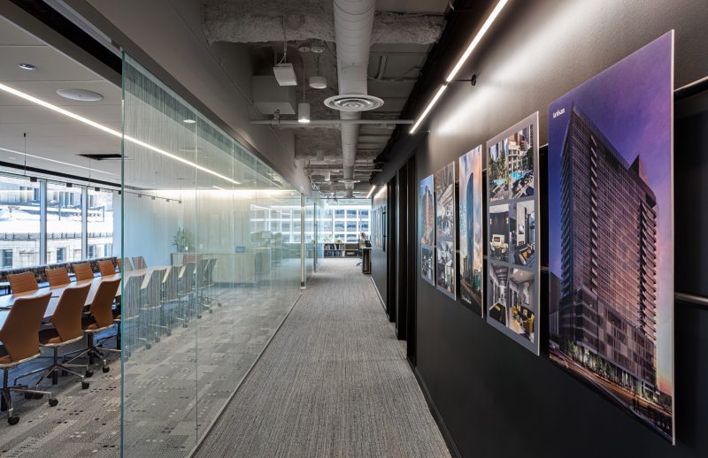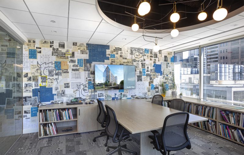 The heart of the office’s culture–the lunchroom and break spaces–sit at the office entry, creating a hospitality-like café for employees, clients, and guests to rest, connect, and get work done. The Café features a rotating collaborative art installation and other original works by staff, reinforcing the firm’s creative culture and sharing individual talents. Further into the studio, glass partitions allow a generous amount of light to flood the space, creating an environment where everyone is close to daylight. In fact, the space with the best panoramic views of downtown—in a location where one might expect a private office—is a light-filled collaboration space that includes an installation by local street artist Penny Pinch that gives new life to pages from old architectural books and manuals. With the exception of private spaces for HR and Accounting, the studio is exclusively made up of shareable spaces—notably at the center of the workspace, which the firm has termed the “Spine,” a nucleus from which collaboration can be achieved through open and closed spaces to meet each team’s needs.