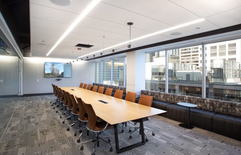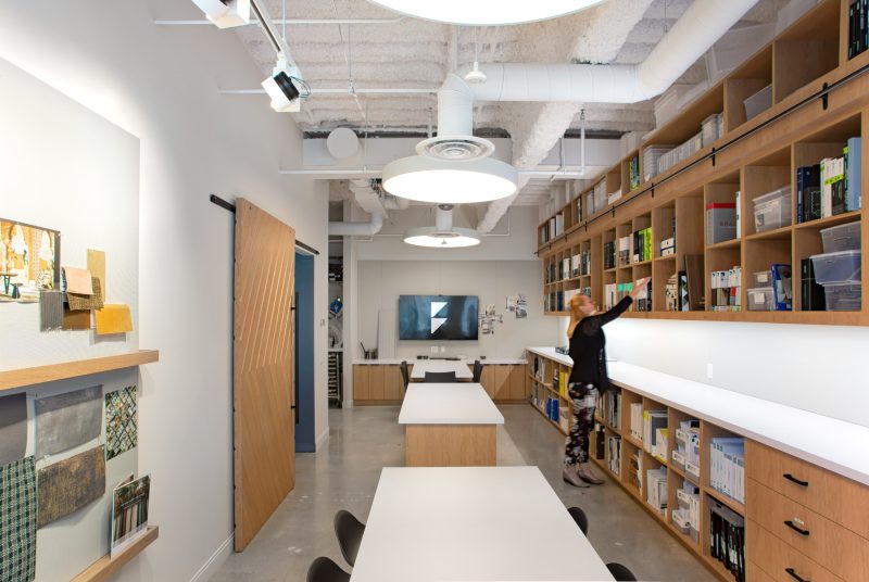Technology is deployed via the latest digital collaboration tools to allow a range of presentation options that seamlessly link local and remote participants. Light fixtures with controllable color temperatures pair with natural light from windows to allow teams to evaluate materials and colors in a wide range of lighting conditions without leaving the studio, and a VR studio room supports three-dimensional design and virtual viewing experiences.”