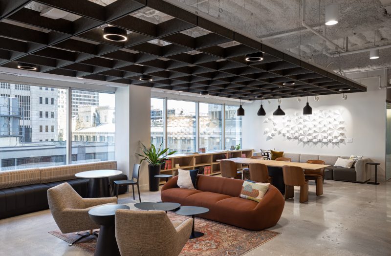 “The dynamic, flexible spaces are acoustically zoned so people can find the place that suits their working styles and needs that day—from energetic shared spaces to quiet areas for focus. Generous daylighting, plants, air and water filtration systems, efficient mechanical systems, and many earth- and people-friendly materials are designed into the space to achieve green building (LEED) and health & wellness (Fitwel/WELL) certifications. Adjustable workstations, ergonomically-appropriate collaboration areas, comfortable lounge seating, and healthy snack offerings ensure one’s physical condition is also nurtured.