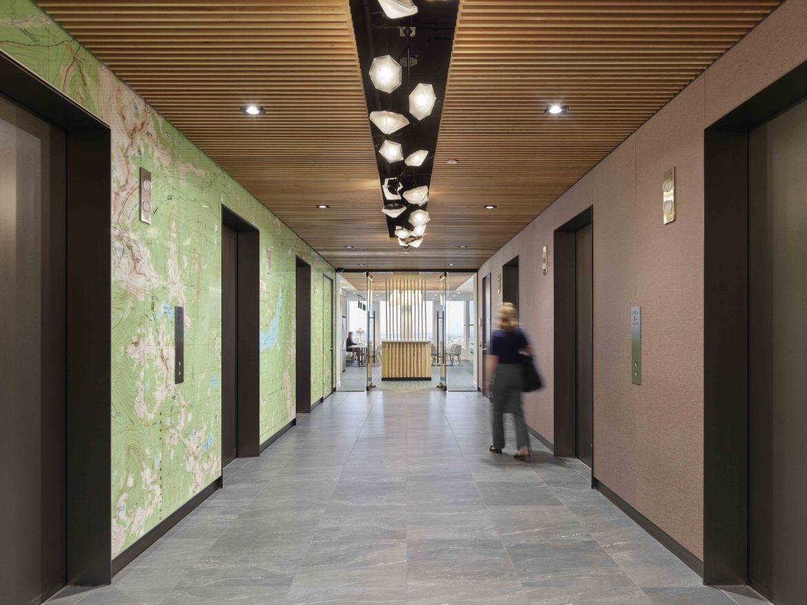 Aesthetically, the Seattle office’s design pays homage to the Pacific Northwest through the use of natural materials like locally-sourced wood veneers and optimal access to natural light. The work environment’s glass perimeter allows occupants to access beautiful vistas of Seattle, including gorgeous water views and the iconic Space Needle. The main elevator lobby features a 62-foot-long topographic map of the area surrounding Seattle, paying tribute to the nearby stratovolcano Mount Rainier, which is also visible from the 44th floor office. Custom branding was also implemented throughout the office with Fox Rothschild’s logo strategically placed to provide visual breaks across the glass that divides the space. Full glass office-fronts forgo the use of film, expanding sightlines that serve to make the space feel larger, while collapsible and mobile glass fronting allows these spaces to become multi-functional on an as-needed basis. Overall, custom branding reinforces brand identity while paying homage to the firm’s locale.