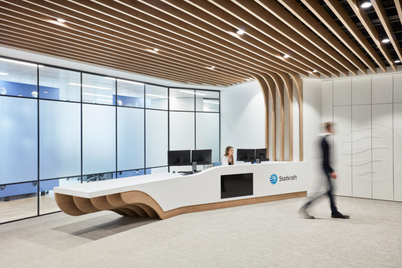“Conceived to enhance the embodiment of brand, the project started with a strong design scheme that sought to emulate the concept of renewable energy; the collection of renewable resources, such as wind, rain, and sunlight which are then transformed into energy. Seen through the continuous repetition and layering of design elements throughout the space, prominent design features evoke a sense of connection between natural and made objects, fostering connects to the core purpose of the Statkraft business.