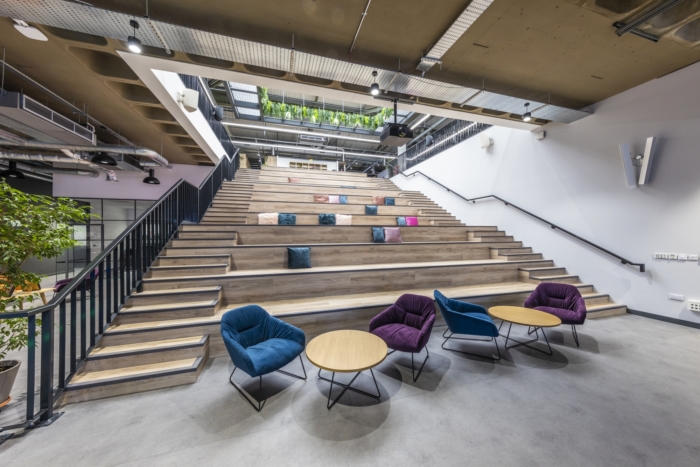 The end result is a stand-out showcase for CAE the brand and CAE the home. Visitors step into an open reception area with a light-filled atrium connecting the ground floor to the first floor. Exposed ductwork and crittal windows give a modern industrial vibe, softened with planting and pale timber tones.A stunning tiered seating installation sits at the centre of this area. Viewed as the heart of CAE, this space is ideal for informal ‘town hall’ meetings or receptions and larger events that bring the whole CAE team together. Outside of these times, staff use this area much like people would use town hall steps on a warm summer’s day – for a quiet coffee, a quick telephone chat or a catch-up with work friends.