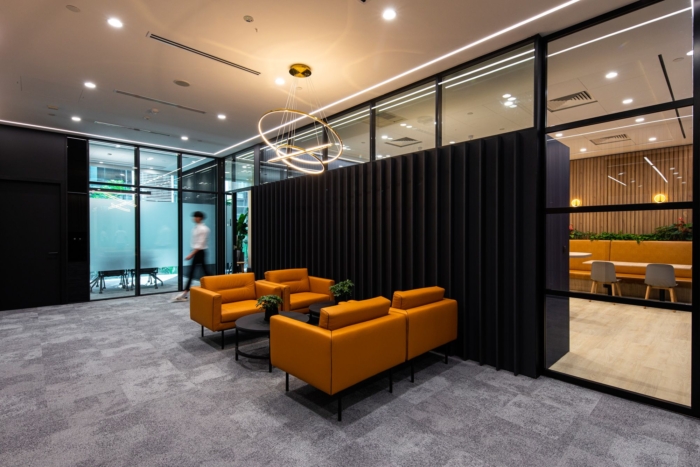 Designed mostly in shades of black with accents of timber and greenery, the flexible and progressive space artfully strikes a balancing act to ensure the space is edgy and bold yet vibrant. As soon as one enters the reception area, the green wall and a contrasting coral sofa catches the eye, and the same vibrant hue can be seen throughout the space.