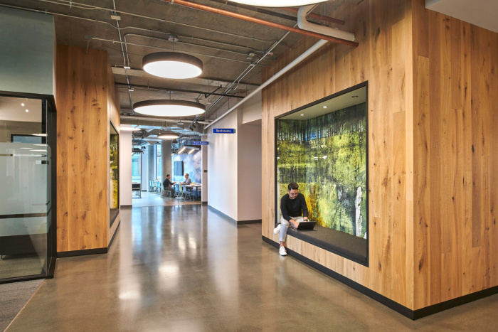 Along the Boulevard, natural elements occur in the wood material planking, luminous skylight-like lighting, and abstracted visual patterns and images. The open offices feature refined textures, geometric cotton batt acoustic ceilings inspired by map grids and vibrant colors to further emphasize the dynamic landscape. We subtly change the environment as one moves through the space and highlight the differences. Ancillary pieces and graphic elements add varied levels of social engagement and excitement. Quiet parklet lounge spaces about break rooms. The end result is an engaging and visually exciting space.