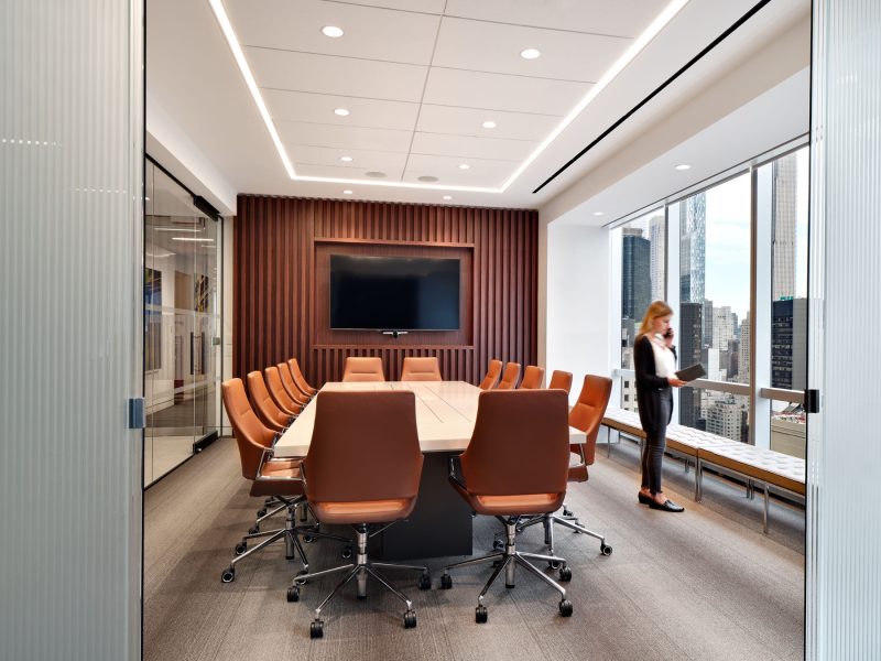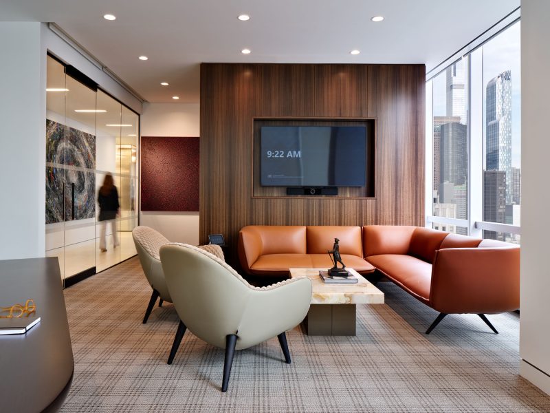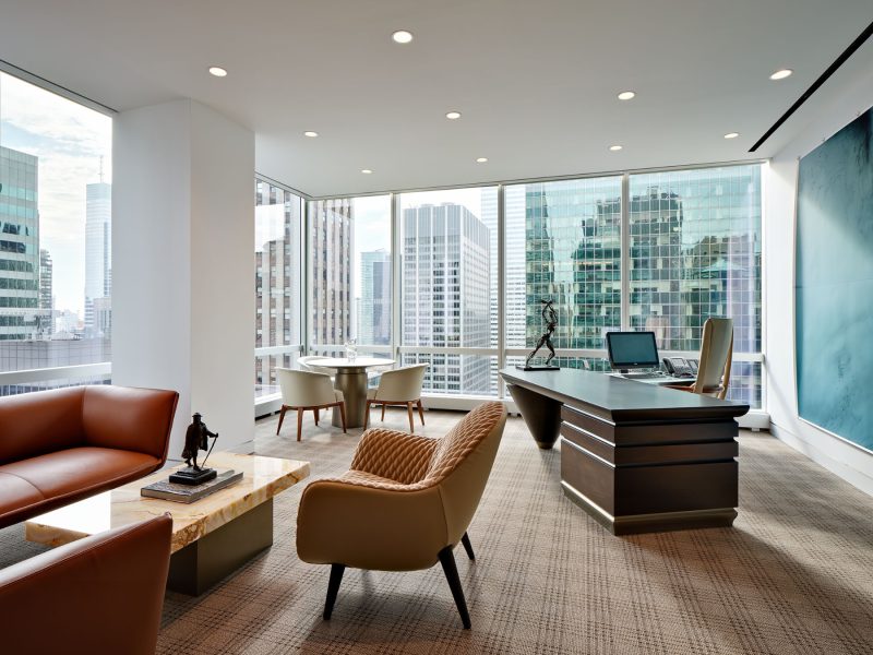 The boardroom, immediately off reception, became an extension of the new design language of the lobby. Fluted wood walls in the same tone as the lobby bookend the space. Rather than replace the custom conference table, the design team conceived of a way to refresh it in place. The stainless-steel base was re-skinned in bronze metal, and the white stone surface was restored. Existing Knoll benches were reupholstered in a warm leather tone and new lighting was installed, bringing all the new materials to life. The CEO’s office, which is positioned strategically between the boardroom and lobby has always been the heart of the space. Perched on the building’s corner, visitors feel that they are both floating above the city yet grounded by the space.