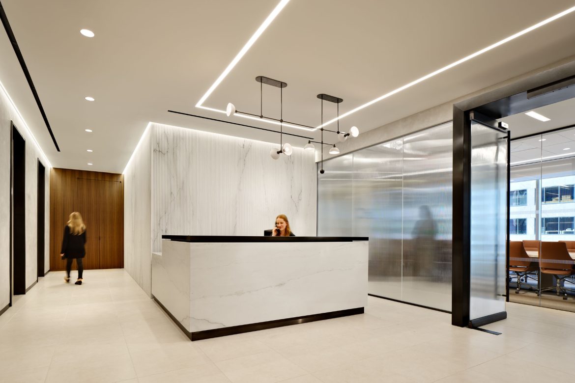 The fluted glass wall encircles the reception area and opens visitors to the exterior view while still providing privacy for the adjacent conference rooms.The reception desk is anchored against a fluted marble wall, rotated from its original position, welcoming both visitors and staff. Art has historically been an important part of the office culture and was an important driver in the development of the design dialog. Richly toned paneled walls bookend the lobby, creating a contrast with the white stone and fluted glass, a play on materials that makes the lobby feel both airy and warm. A sculptural light fixture by Apparatus Studio anchors the ceiling plane above the reception desk. The bronze arms of the fixture feature delicate porcelain shades, echoing the constant balance of light and depth.