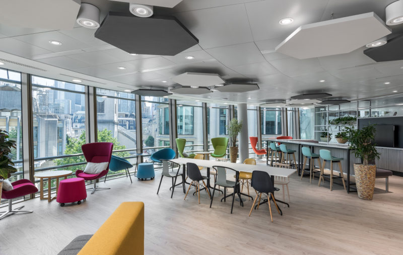 As our client’s leadership team travelled frequently, they decided to sacrifice their executive office suite in favour of open plan desking and agile workspaces – promoting communication across all levels of the business and stimulating a culture change. Prime views of Gresham Street are best enjoyed from the floor-to-ceiling windows of the corner of the building; a well-lit space that was formerly used for boardrooms and cellular offices, but has now been given to staff as a central social hub. We introduced vibrant, textural fabrics, warm, natural materials, and biophilia to bring life the spacious teapoint which can be used for social gatherings or town hall meetings.