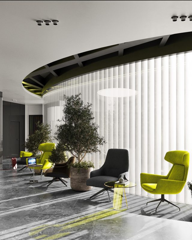 “The project is very interesting! The work on it was painstaking and long, but full of inexhaustible enthusiasm and imagination. We were inspired by Expo 2022, the green pavilion of Singapore, developing the concept of phytodesign,” said Anastasia Apostu, project manager. The accent feature of the interior is the internal atrium with landscaping. It is a glass cylinder with a lush oasis inside.