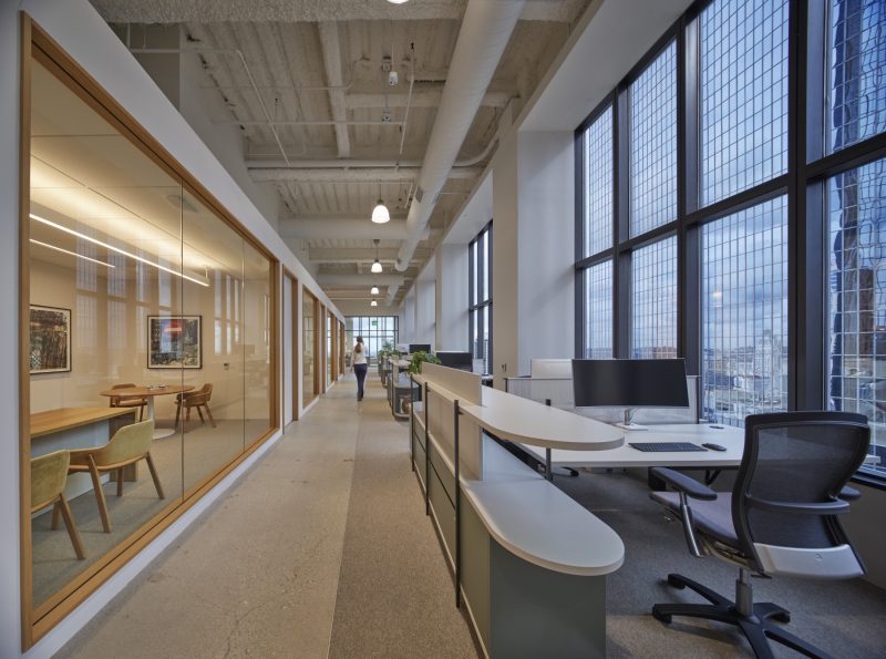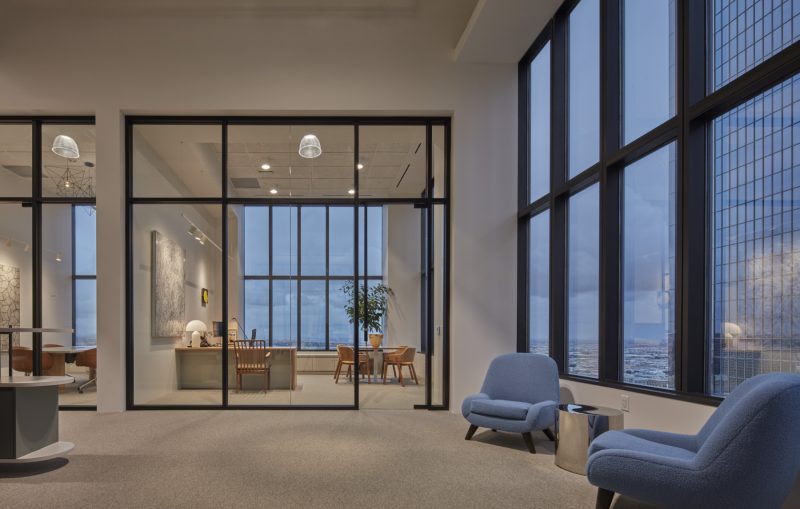Transparent private offices are in the project’s core while open workspaces surround the building perimeter creating an egalitarian bright work area filled with natural light and views of the city skyline. The architecture, with its clean, simple lines, and elegantly detailed office fronts trimmed in white oak, lends itself as the ideal backdrop to the client’s impressive art collection. It is complemented by the circulation spaces, which double as curated fine art galleries.”