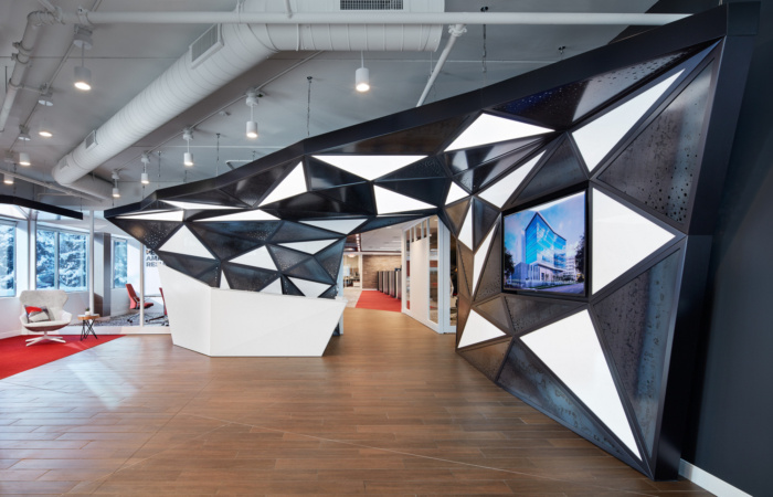 The office layout is enlivened by open areas that allow daylight to penetrate deep into the space and provide views to the outdoors. Internal gathering spaces are marked by tessellating clouds consisting of both perforated dark metal and backlit panels, a continued reminder of the company’s manufacturing expertise.