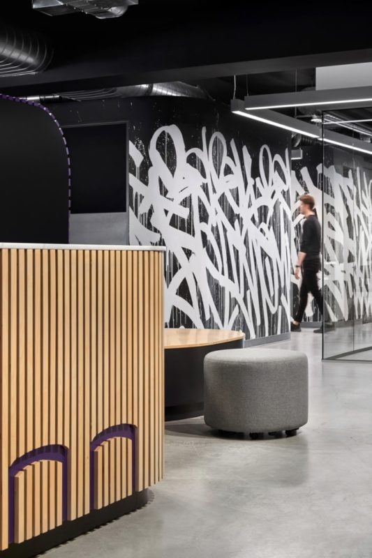STUDIOSC principal, Stephen Conte, immediately thought of a university colleague who has been crafting a name for himself in the artworld, Bisco Smith. “Bisco’s work is all about written narratives using street art that resonates with New York. 1000 Heads prides itself as a word of mouth agency with a unique story to tell. Combining the two felt natural and merged their story, art and architecture as the driving concept behind the project.”