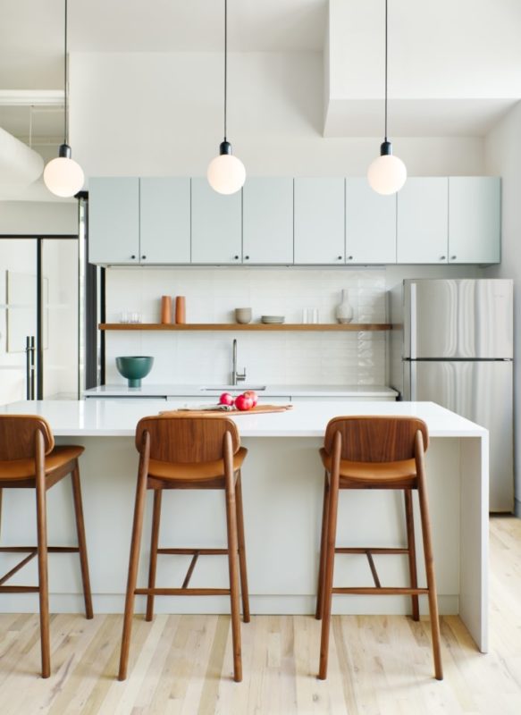 A base of tonal whites and light wood make variations of the brand colors really pop, adding richness and elevating the design. Custom walnut built-in shelving is designed to ground the main open office space and add a little drama and give the vibe of a residential library. A centrally located pantry and main lounge to make the small space feel large and open and to maximize natural light throughout the office.