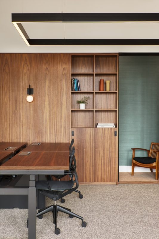 In a post-COVID landscape, 3L wanted the space to prioritize comfort so Float gave it touches that felt more residential: layered natural materials and textures such as sisal carpet, grasscloth wallpaper, light and dark wood tones in the furniture and millwork.