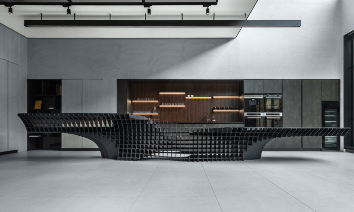 The two units yield multiple compositions and expansions in response to distant characters. The cubic unit is applied on the couch, blanket, and steps, where the cubes cover the multi-dimensions of up and down, left and right. The stereometric layering defines the openness of multiple compositions on the first floor, such as the movable layout of the furniture, the salon area for a small lecture, and the gathering. The transparent door with a steel frame connects the inside to outside, implying the interlocking relationship between the two.The black steel panels form the curvaceous unit and the layering of geometric shapes are distorted and divided like an organic morphology of water bar, information desk, and the long dining table. The working desk on the second floor combines wood joints with steel panels. The structure looks like a butterfly that appears light and heavy at the same time. The symmetric shape facilitates the smooth circulation of the workflow.
