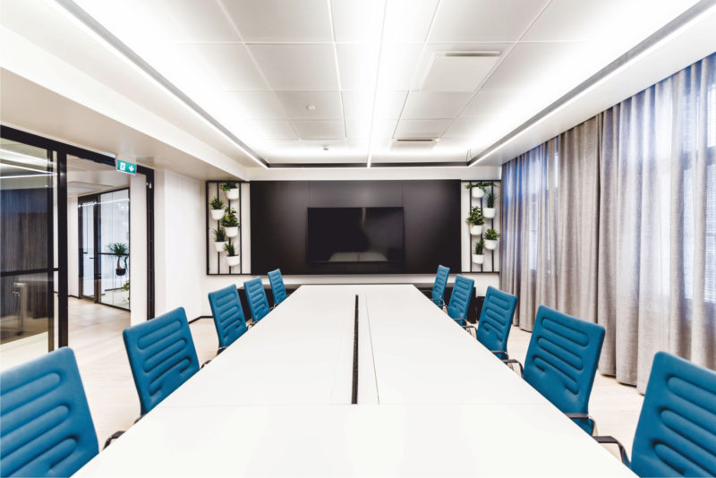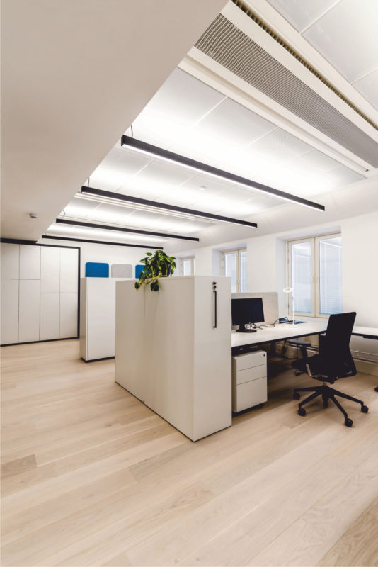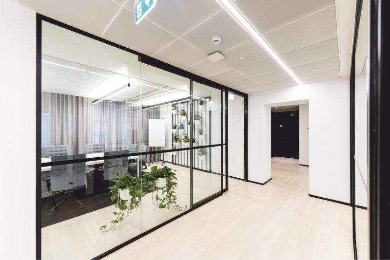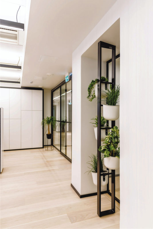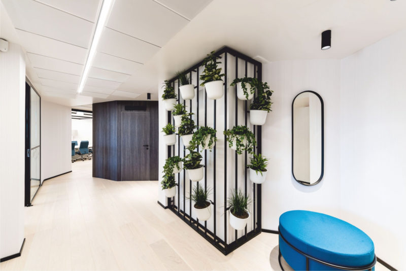 “The goal of the project was to create a prominent office space with an element that would bring a distinguishable characteristic to the space. The idea was that the element would change shape depending on the space, thus creating a continuous theme that continues throughout the office. This was achieved with a green rack system designed especially for this project.