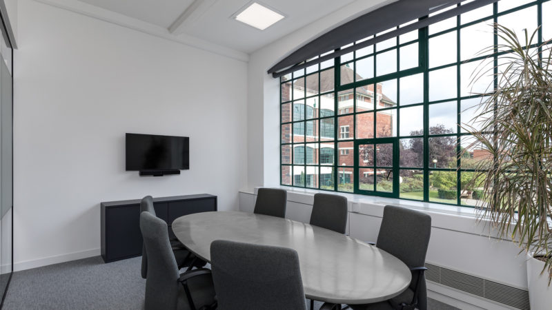 While subtle nods to Bionical Emas’ brand reflect their global identity, a neutral colour palette allows the imposing windows to evoke the manufacturing history of the building, giving their Hertfordshire office its own distinct identity. Nature is welcomed into the space with indoor planting, while desks are positioned around the building perimeter to maximise views of the outdoor green space and promote employee wellbeing.