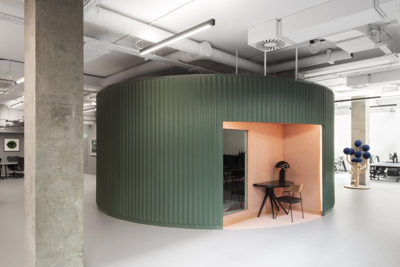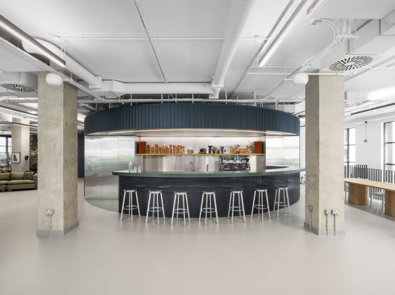 Co-founder and Director of Bureau de Change Billy Mavropoulos explains, “Each of the volumes are clad in painted routed timber surfaces, informed by the vertical seams of traditional iron kilns. The cut-outs are finished in a rough clay plaster, juxtaposing the sharper articulation of the cylinders with warm cave like textures further adding to the journey of materials, textures and colours in the space.”At the ground floor, the open plan lounge in the centre links the reception in the front with the open plan production desks in the back. The exposed production desks are undesignated, allowing for ease of access and flexible impromptu usage. The kitchen inhabiting one of the cavities is cladded in stainless steel to reflect light and act as a distinct centrepiece of the room by the entrance becoming the social core of the office. Handmade glazed ceramic tiles circumnavigate the curved recycled plastic countertop.