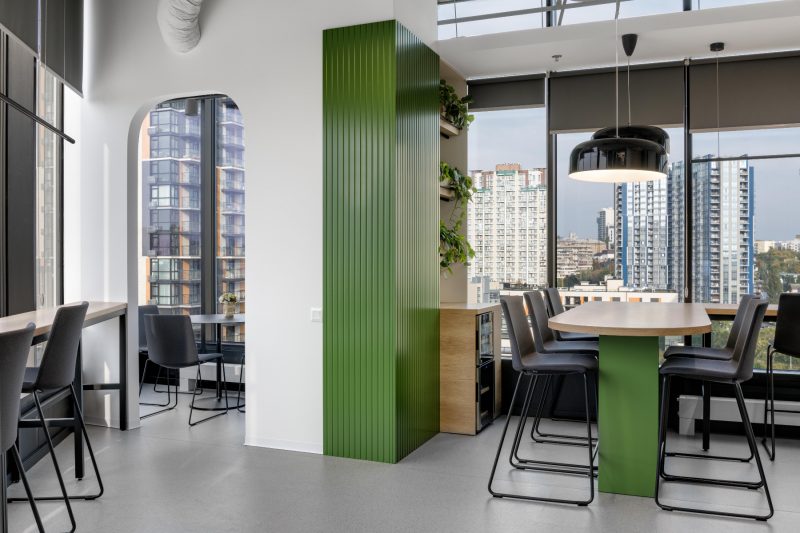 Separately, it is worth emphasizing the lighting, which has become a characteristic style solution. Linear and individual lighting fixtures in combination with soundproof panels under the ceiling create a playful geometry and immediately attract attention. “You always have a team behind you”, a motivational inscription in the backlit front office area, is another of the eye-catching lighting solutions. Panoramic windows that provide a lot of natural light and open extraordinary views of Kyiv from any corner of the office, give the space a sense of boundlessness, and the people who are in it – a thirst for conquering the peaks”