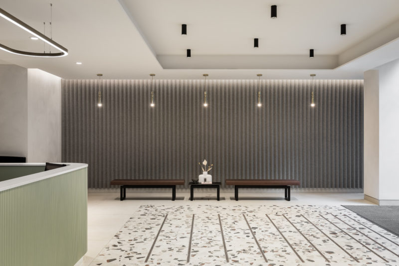 The communal areas feature an eclectic mixture of materials, lighting and metal finishes, with a natural feel that is further enhanced by the soft and pale aesthetic. By giving the reception foyer a complete facelift, we have created a tasteful and welcoming space that engages at street level and delivers an impressive workplace experience for businesses in the heart of the financial district.
