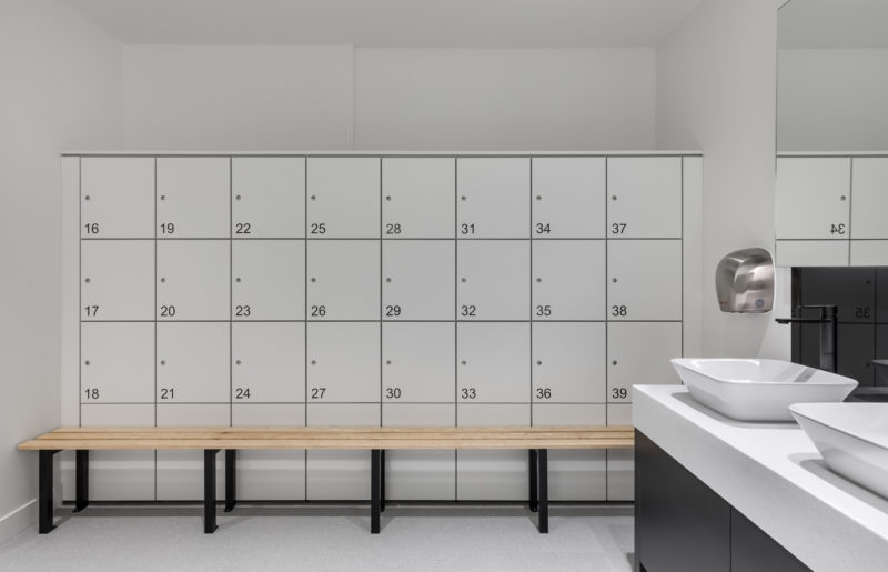 In order to stay competitive in the current landlord market, Commerz Real recognised the need for better common facilities and features to support employee wellbeing. We revised the space available in the basement and lower ground floor to strategically incorporate bike storage, showers, lockers and changing facilities. This process involved reengineering an elevator, cutting new openings and installing a connecting staircase to create an intuitive circulation route for runners and cyclists coming up from the bike storage, to the washrooms, and finally up to reception and the office floors.