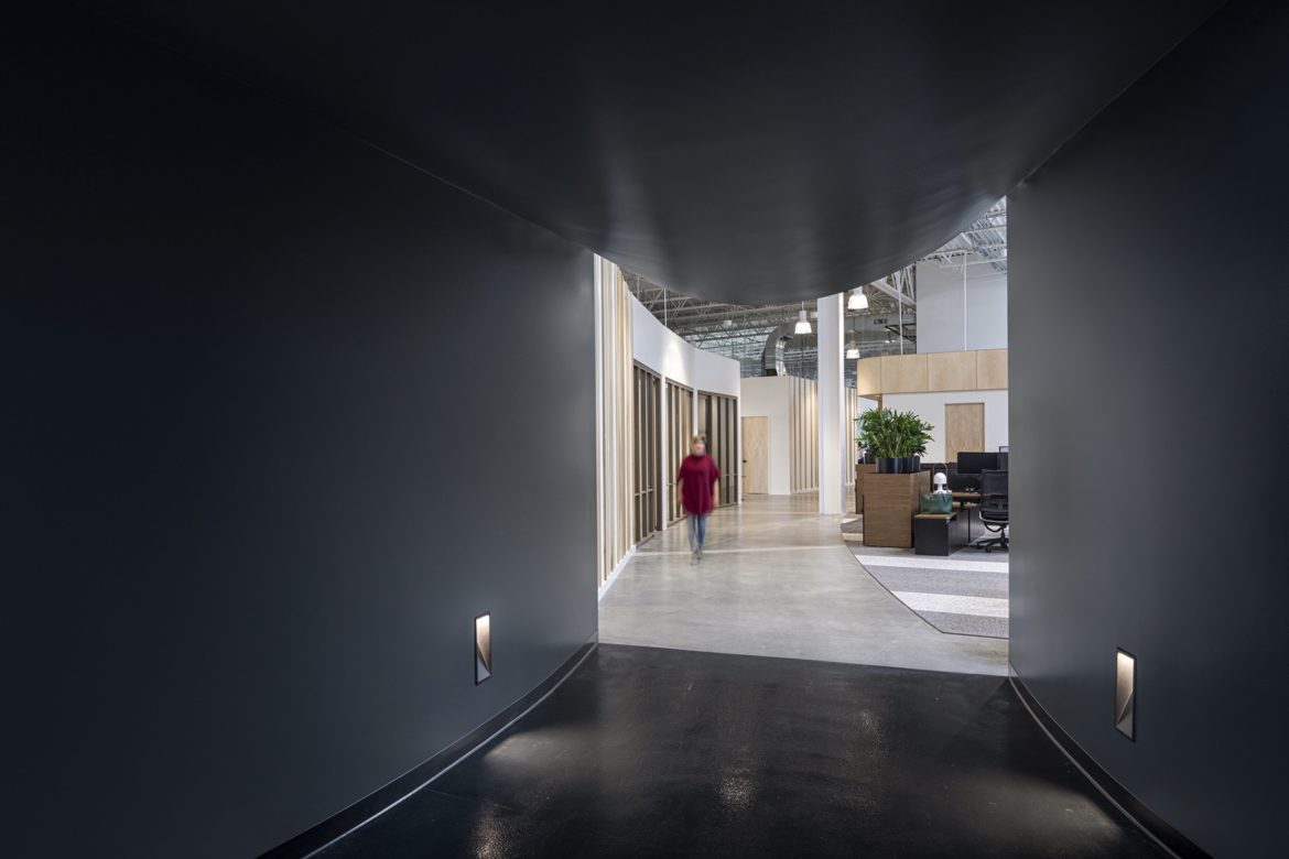 The office is designed to encourage access to daylight and the outdoors. Eight large garage doors invite employees to seamlessly bring their outdoor adventures inside. Throughout the space, opaque, translucent, and transparent layers intermingle to create a sense of wonder and intrigue. Even the more private software engineering scrum rooms that are tucked away at the western edge have passthroughs to green indoor parks and transparent walls that invite interaction and observation.