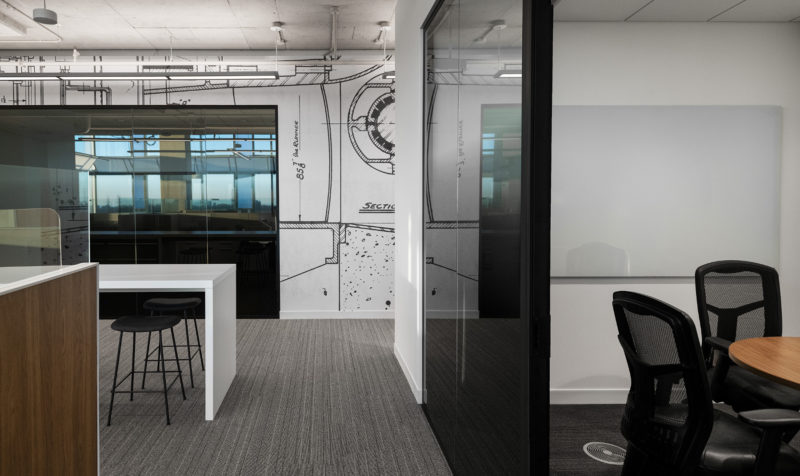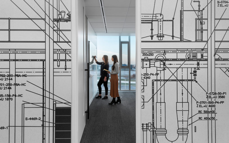 A sophisticated design incorporates a marriage of industrial and natural themes. Floor to ceiling windows allow light to shine in for all throughout the visually connected space. Custom artwork symbolizing their environmentally conscious attitude adorns the walls, as do graphics created from hand-drawn architectural drawings which celebrate the company’s history. A variety of work environments are placed throughout, with great views of the city, and with large spaces to gather as a company all support ERCO Worldwide’s new vision for their future,” says figure3