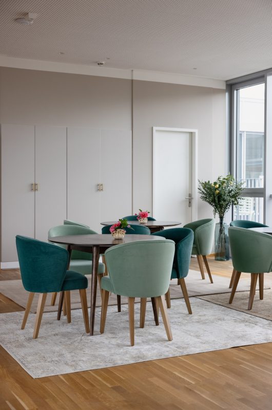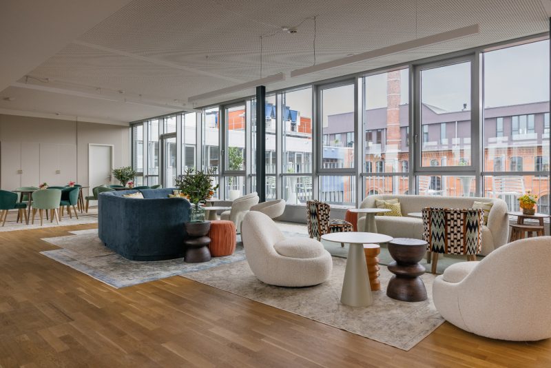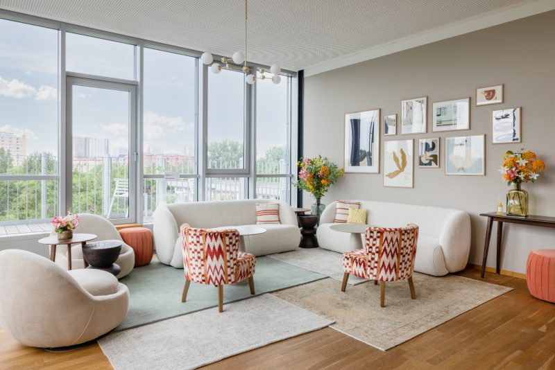 The studio’s proficiency for cozy and eclectic interiors played out in full. The renovated community areas were equipped with comfortable chairs and sofas, as well as fun yet elegant prints. The neutral color palette delivers a sense of tranquility and peace within the office, with some light touches of vivid colors to add some warmth to the whole environment,” says Studio Eliste.