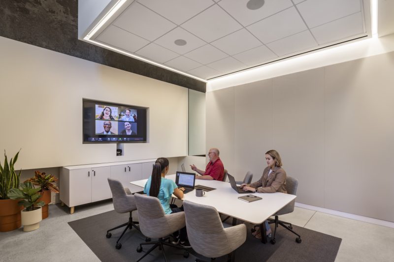 “The design features a simple sequence of spaces to promote a growing practice, organized into three areas: meeting, studio, and service. Visitors to the office enter a flexible, collaboration-focused space, free of a traditional reception desk. A glass wall with drapery separates the entry from a meeting space intended to receive guests and provide a place for teams to gather. Continuing past the meeting space, the studio is housed in a single open space, representing where everyone gathers to create “under one roof.” The studio is open and voluminous, accented by functional pin-up walls and flexible furniture. Bookcases nestled under the pin-up wall house project and materials storage. Finally, the service area is separated from the studio with a series of enclosed spaces including phone rooms, a wellness room, and IT services. The kitchen is semi-enclosed and acts as a flexible meeting space meant to be activated outside of typical kitchen use. A back door exits to adjacent, landscaped outdoor space.