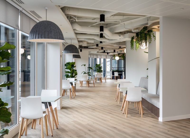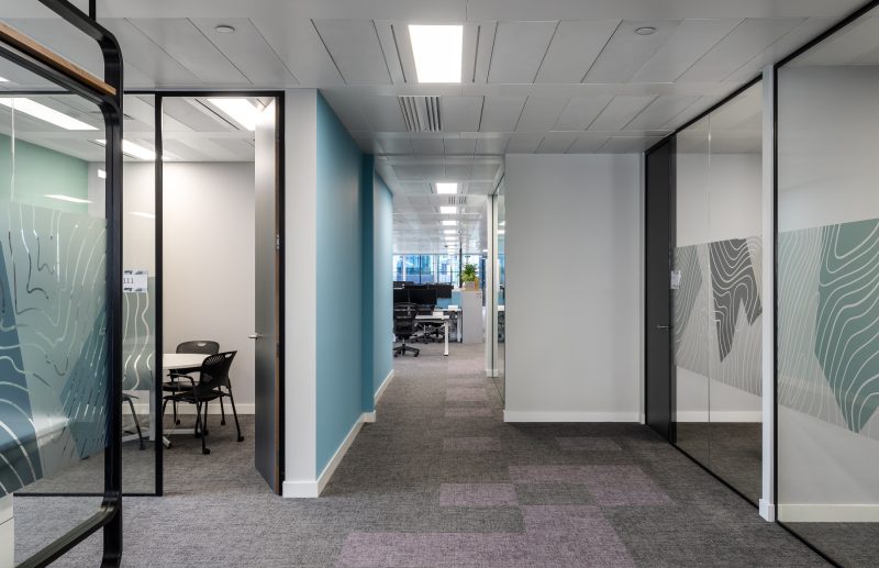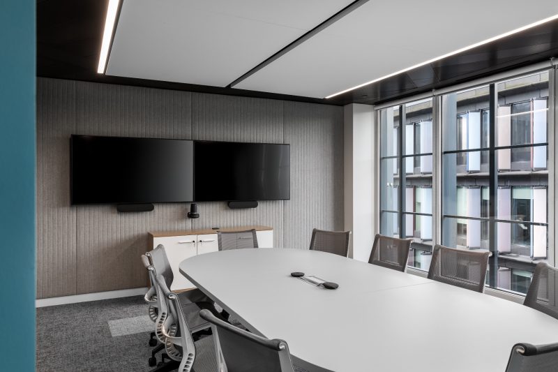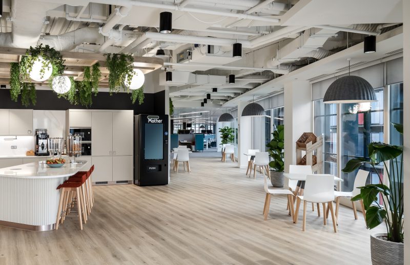 Collaboration, social, and wellbeing spaces are prioritised in the design. A spacious refresh and breakout hub features warm timber flooring, bespoke joinery with hanging biophilia, and soft seating booths. Employees also have access to a wellbeing room, a multi-faith room, and private offices for focused work. To foster a sense of community, desks are positioned in neighbourhoods which have touchdown meeting spaces throughout. The flexibility and range of amenities contribute to an inclusive workplace that supports the work styles of each individual.”