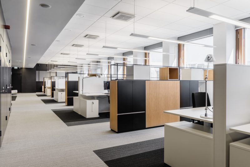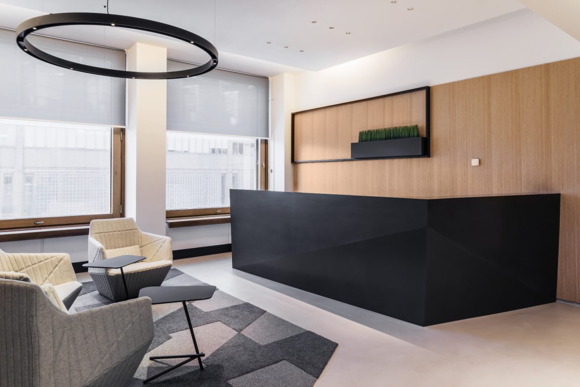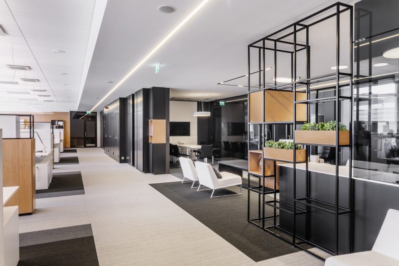 Architectural touch manifests itself in the creation of long perspective lines from black profile lamps embedded in the ceiling and a clear rectangular pattern on the carpet. The black profile structures in the furniture between workstations, kitchen and hallway hangers complement the clear design line. The black and white colour scheme combined with grayscale is the perfect backdrop for geometric shapes. The small addition of striped veneer to wall upholstery and office cabinets gives warmth to the neutral palette.”