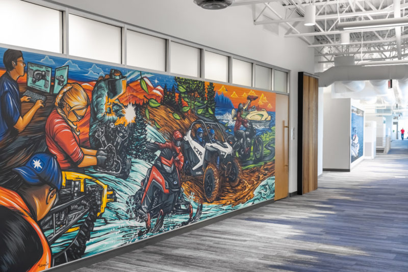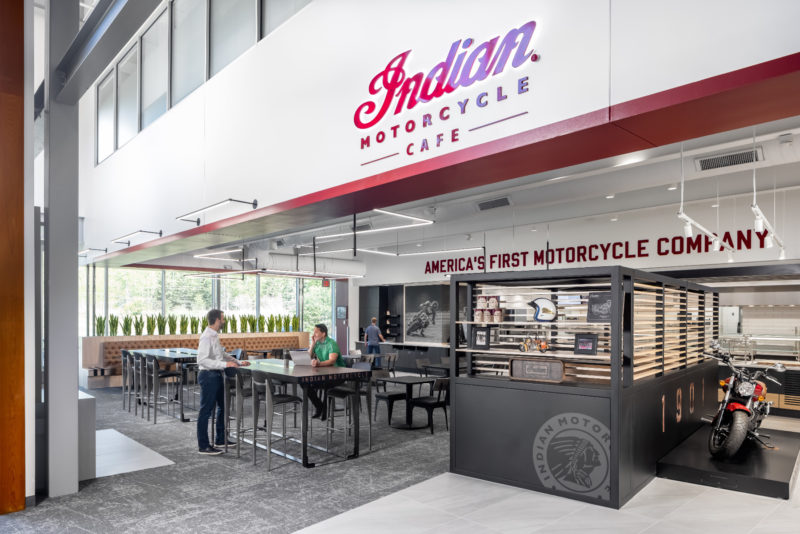 With a spotlight on employee amenities, NELSON reimagined Polaris’ collaboration and gathering zones. By centralizing all vehicle displays to the showroom, the team created more breakout spaces within the open office and introduced new graphic displays. This included updated employee work cafes, a new boardroom and executive pantry, and the refresh of all employee work zones.”