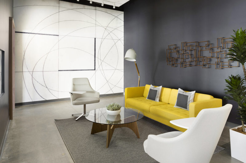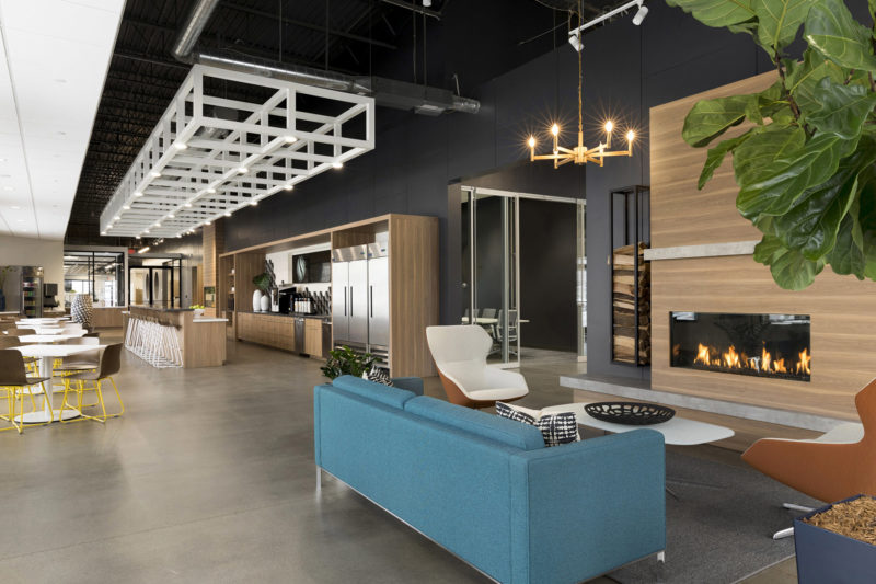 The design needed to embrace the building’s existing conditions. In keeping to their strong midwestern roots, we created a concept centralized on the company’s HVAC background. Each area was defined by an artfully inspired feature to celebrate the company’s industry. The visual interpretation of airflow and movement, along with the mechanical aspects of the HVAC industry were represented throughout the space in the form of wall graphics, an exposed ceiling deck to highlight the buildings HVAC system and a massive, suspended architectural lighting element in the primary entertaining space.