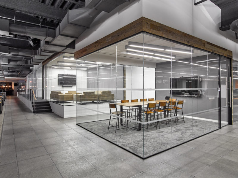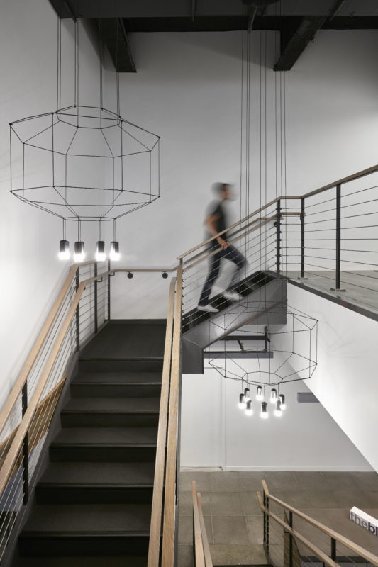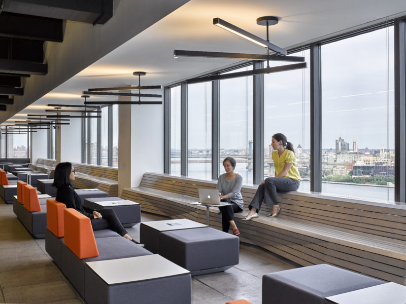 Among the priorities of the design: inspiring creativity, fostering collaboration between the accounts- oriented and creative teams with ample room for a variety of meeting spaces, and leaving the views of the river and beyond unobstructed for all to experience. These goals were achieved by creating three distinct sections within the open office areas, which were further distinguished by being set at various elevations: raised platforms with offices and conference rooms, workstation areas, and perimeter meeting spaces.”