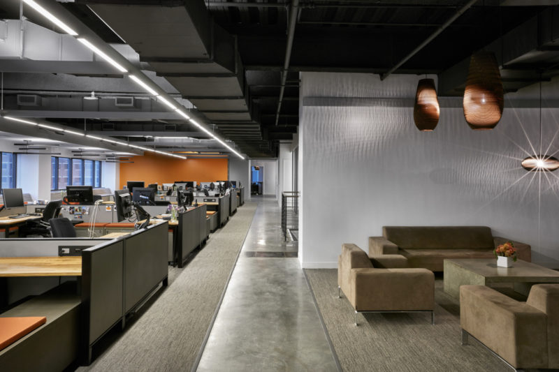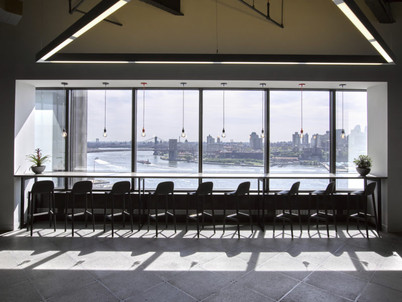 The historically industrial, mercantile and marine context of what is now the Financial District in Manhattan inspired the overall aesthetic of the space including materials, finishes, and product selections. This inspiration also influenced the design of custom components, including the custom bench system at the office perimeter, as well as workstations with solid wood desktops and raw steel components.