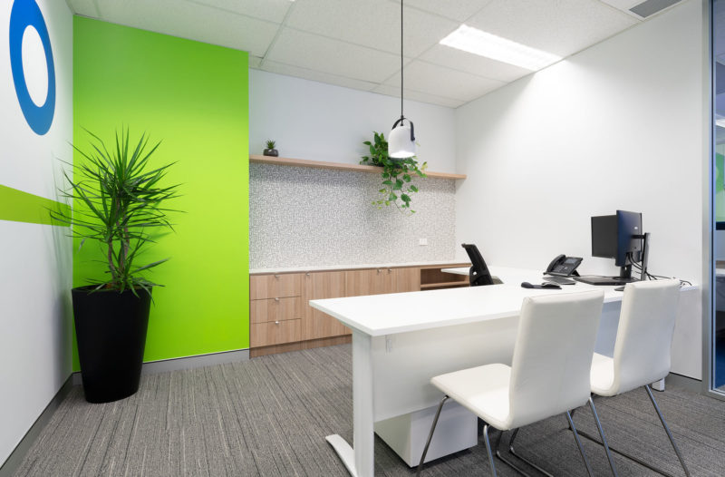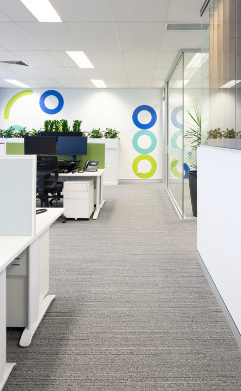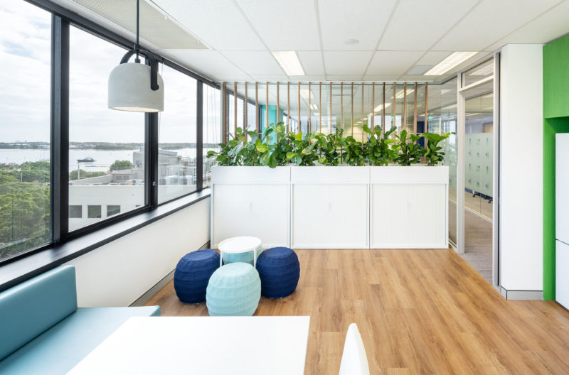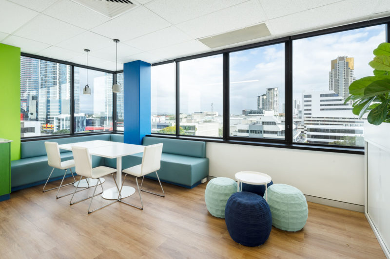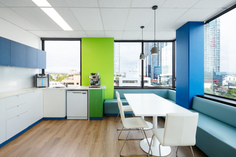 Careful thought went into the planning to maximise workstation numbers, with most of the staff positioned to take advantage of the beautiful Broadwater view. The staff are also well looked after with a bright kitchen, lunchroom and breakout space which continues with the colourful theme.
