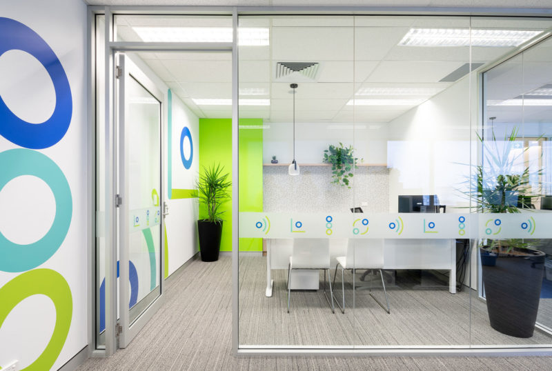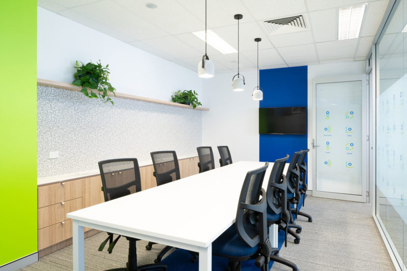The established consulting firms corporate branding was applied creatively throughout the spaces. The reception, the enclosed office and meeting space are flanked by a ‘TTM blue’ stripe that gives connectivity between the zones. A corporate frosted film gives privacy to the newly created meeting room which also displays a new graphic pin-board and feature lighting. Fresh neutral paint with splashes of colour included on selected columns helps to continue the TTM brand through-out.