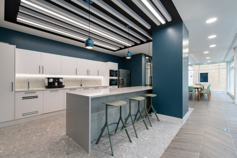 Our design featured an overhaul and expansion of the staff tea point area where were able to incorporate a large family style table to encourage shared mealtimes, a key element of the firm’s culture. The materials through the tea point strike a balance between sophistication and warmth; dark timber flooring and an architecture ceiling feature are perfectly juxtaposed by the softness of colours in terrazzo tile inset floor and engineered stone worktops,” says Peldon Rose.