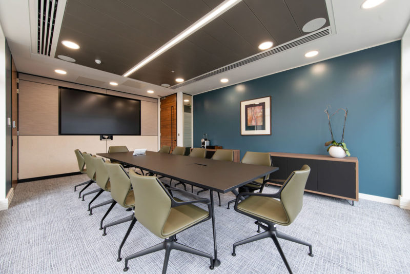 Throughout the workspaces the design is harmonious with key elements of the Vedder Price brand – such as the walnut veneer doors, providing effective solutions such as new architectural ironmongery creating a modern uplift. We created a sophisticated finishes scheme that was harmonious with original features; soft patterned carpets and feature wall paints carry the same aesthetic from the meeting suite through to the new workspace on the seventh floor and refurbished sixth floor.