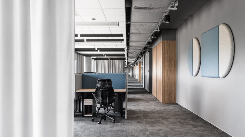 Nordic Cool has become our guide to the creative search for architectural solutions for the Visma Krakow office. As such, we weren’t expected to go into some colorful frenzy. To this effect, light wood, shades of gray and blue, materials such as concrete or stone, prevail in the office space.