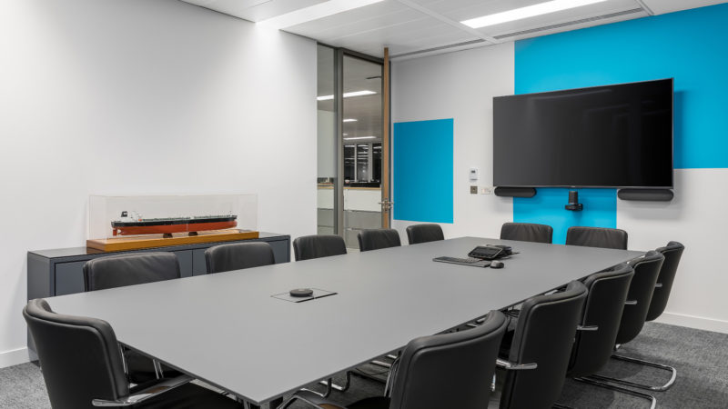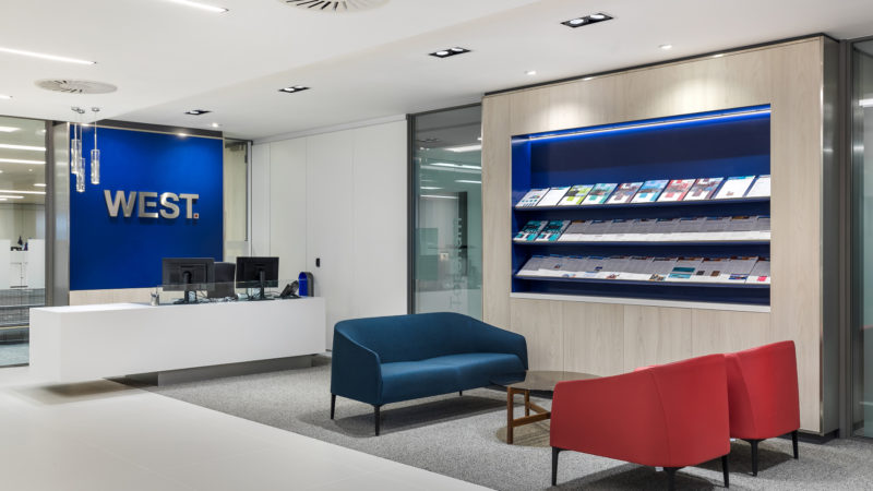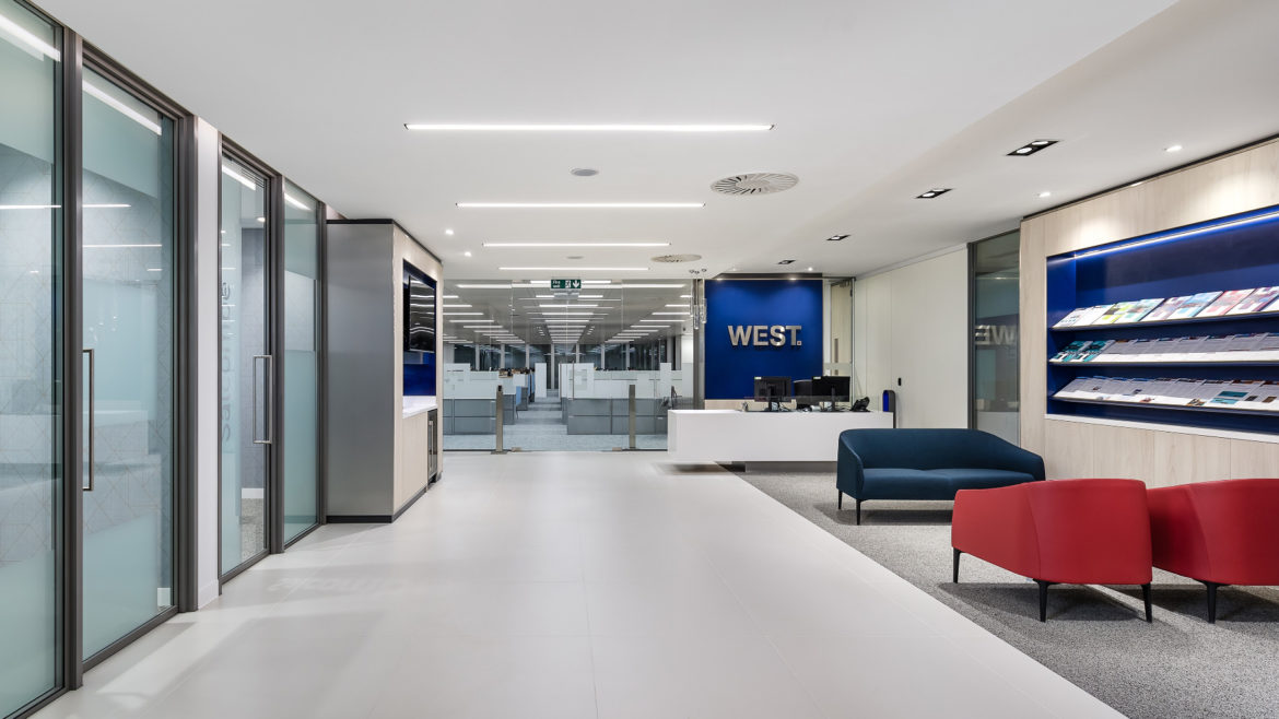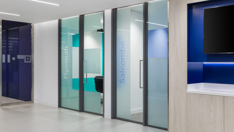“West of England decided to relocate and redesign their office space to help them attract new talent and welcome in a new era for the business. West of England had recently undergone a rebrand and wanted their new office to represent their updated aesthetic. We collaborated with the client’s project team to understand the key messages they wanted to convey in their workspace and their commercial goals. As a leading insurance provider in the maritime industry, West of England were keen to have a nautical theme throughout the office, with model ships, meeting rooms named after famous harbours, and marketing collateral on display in the front of house waiting area.