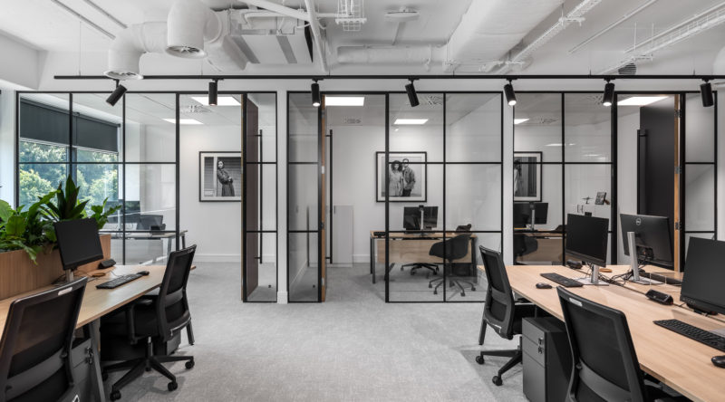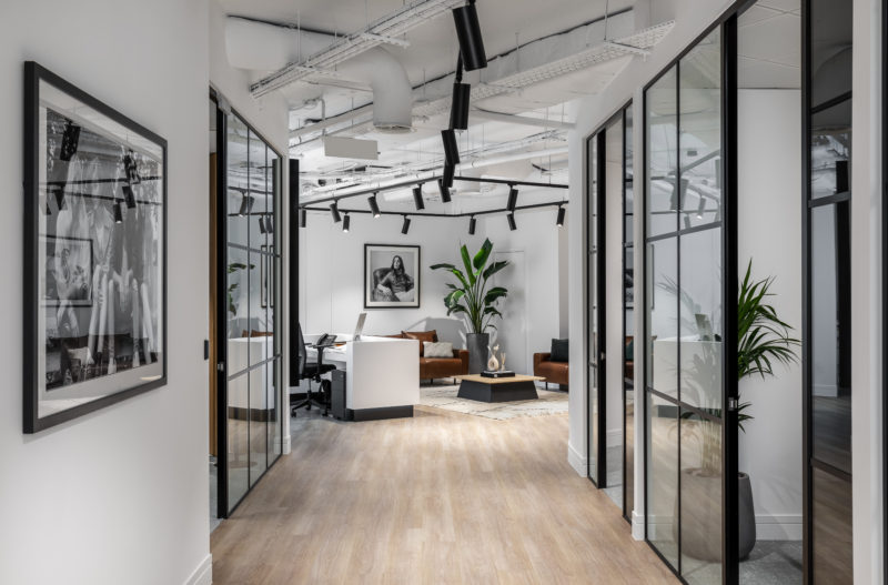 “An impressive backlit display of a BaByliss campaign image greets employees and visitors at reception before they journey down the central thoroughfare that divides the office and gives each brand a contained workspace. We stripped out the services in the corridor and removed the traditional ceiling grid to give the space more height. BaByliss and Conair’s offices flank each side of the corridor which leads to the communal breakout space and teapoint accessible to all teams.