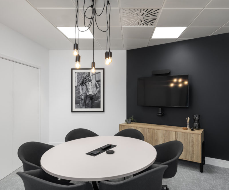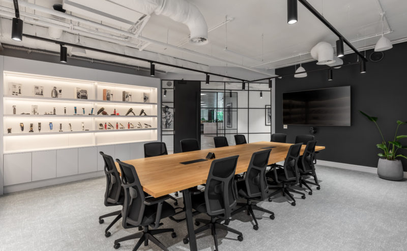 The 14-person boardroom is used by Conair’s sales team and is designed to make an impact. The walls are wrapped in backlit display units that showcase their products, and state-of-the-art AV technology, surround sound and blackout blinds can be used to create an immersive experience. With bespoke workspace designed around BaByliss and Conair’s workflows, both brands are looking forward to improving their overall efficiencies and sales process.”